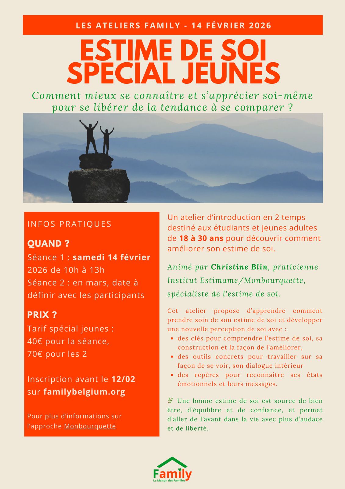 Un atelier d'introduction en 2 temps destiné aux étudiants et jeunes adultes de 18 à 30 ans pour découvrir comment améliorer son estime de soi.